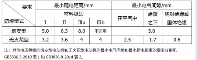 2. 增安型和無火花型電機都對電氣間隙和爬電距離有要求,但在相同電壓等級下,增安型電動機帶電部件間的zui小電氣間隙和zui小爬電距離要求比無火花型電動機的大(詳見表 1),并且無火花電機使用的絕緣部件的材料級別可低至 Ⅲb 級,而增安型電機需使用 Ⅲa 及以上級別的。